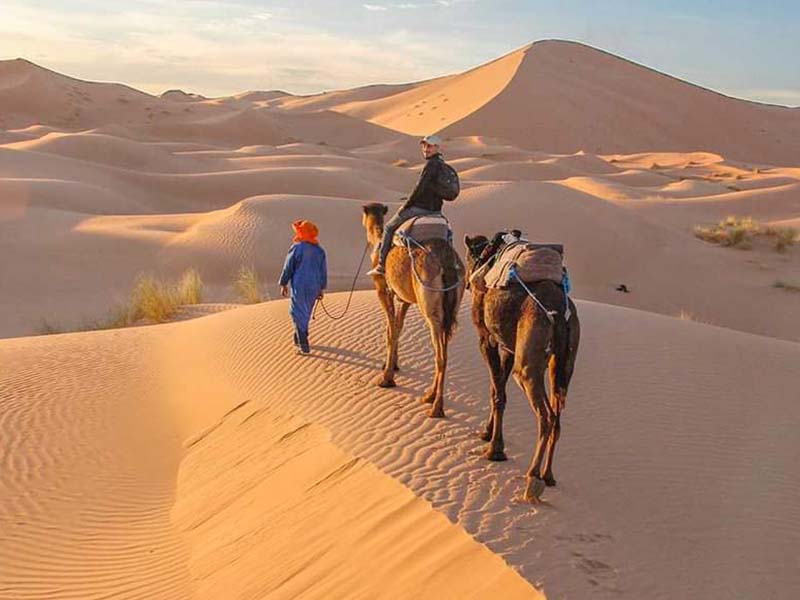 Continue جنوب toward the Sahara Desert, arriving in Merzouga, home of the famous Erg Chebbi dunes—the highest and most spectacular sand dunes in Morocco. Here, you’ll enjoy a memorable camel trekking experience at sunset, crossing the golden dunes just like nomads.